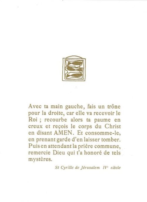 « Avec ta main gauche, fais un trône…. » pour cette carte nous avons choisi la couleur dorée, pour imprimer ce beau texte de saint Cyrille de Jérusalem, évêque de Jérusalem au IVe siècle.